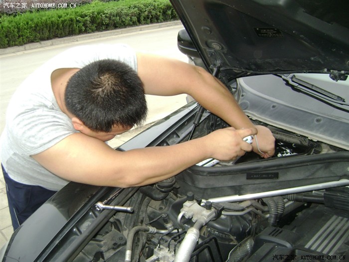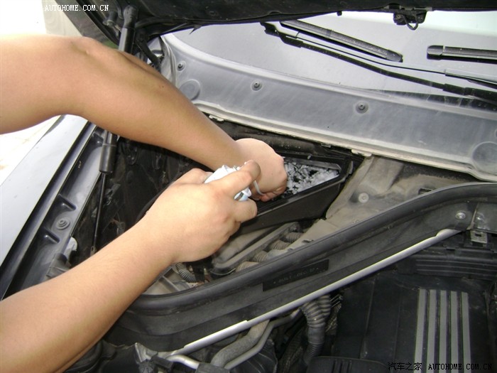 用13号的套筒插下滤网螺丝,旋转90度即可,小心勿损坏!共四颗