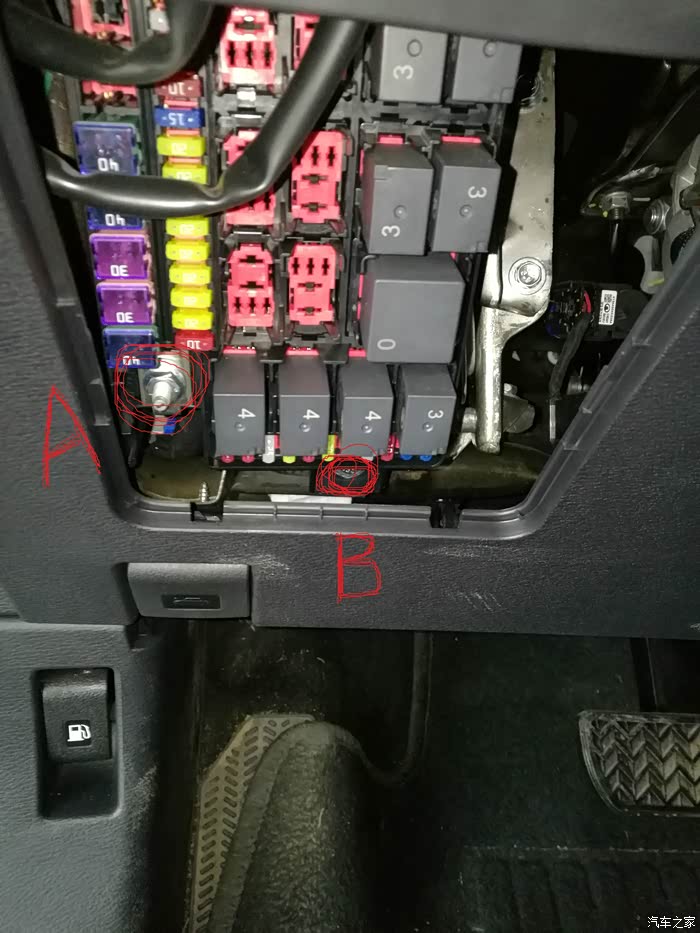 先说明一下两根线负极的位置,千万不要接图中A的位置,这里是有电的。负极要接我图中所示B的位置,说明一下,这个螺丝是需要10个大小的扳手才能拆下。