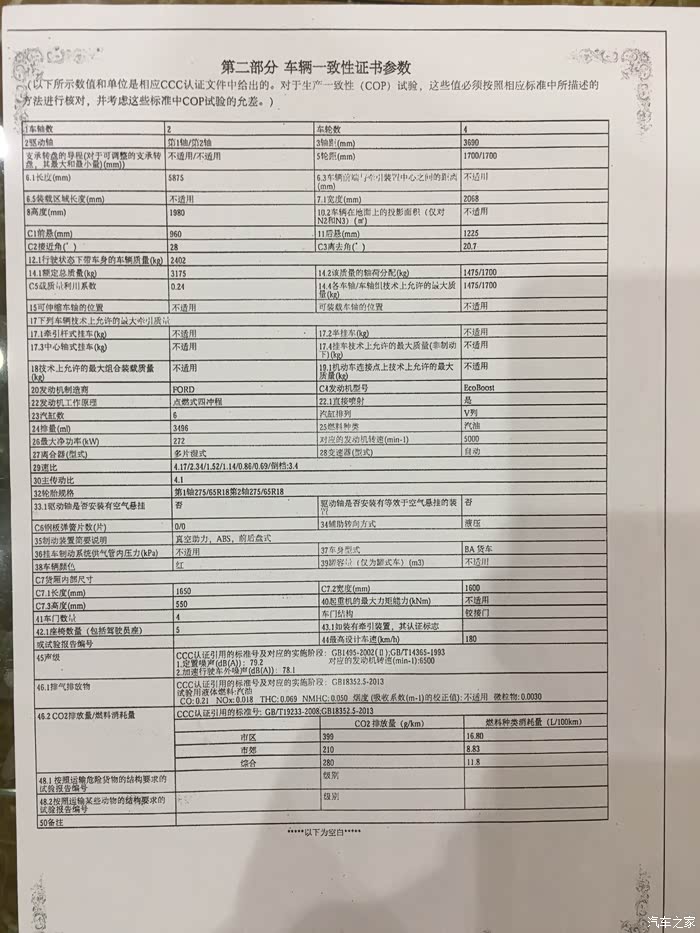 F150公路版的一致性证书参数