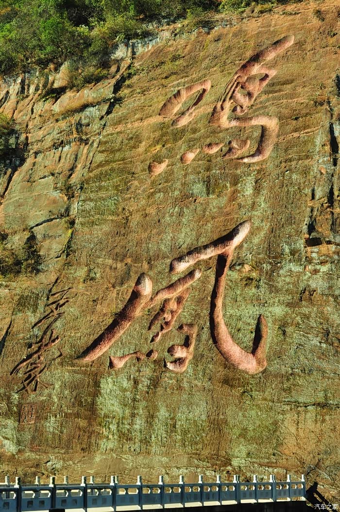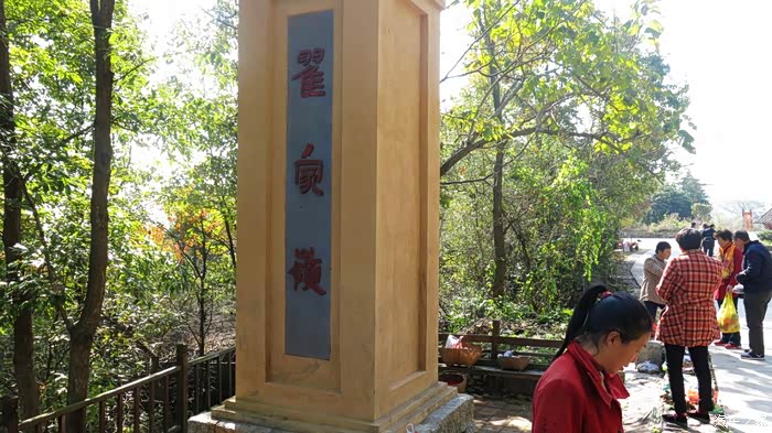 第二天我们来到了著名的鸣凤山风景区。一进入风景区的大圆门,就能看见山崖上两个5米见方的红色石刻大字——“鸣凤”,这是我国当代著名作家王蒙先生的墨迹。我以为,这两个字并不怎么“艺术”,若将此二字当作书法作品来欣赏,且不说其章法和题款的位置,其实并没有多少玩味的价值。不过,因为这是大人物王蒙的手笔,把这两个字刻凿在此,完全是冲着他的名气而来的,正如前些年一些政治家的涂鸦被当着各大政报的报头一样……