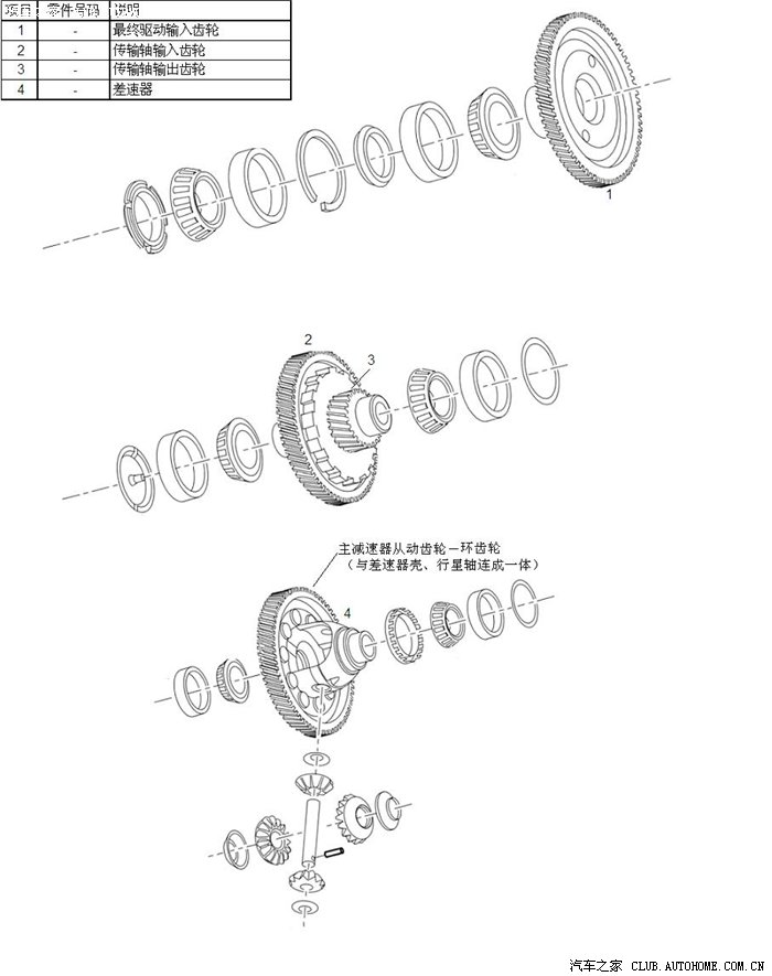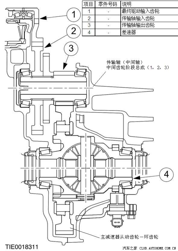 最终驱动输入齿轮使用键连接在前行星齿轮组的行星托架上,并驱动中间齿轮阶段的传输轴输入齿轮(零件2)。中间齿轮阶段的传输轴输出齿轮(零件3),驱动最终驱动总成。