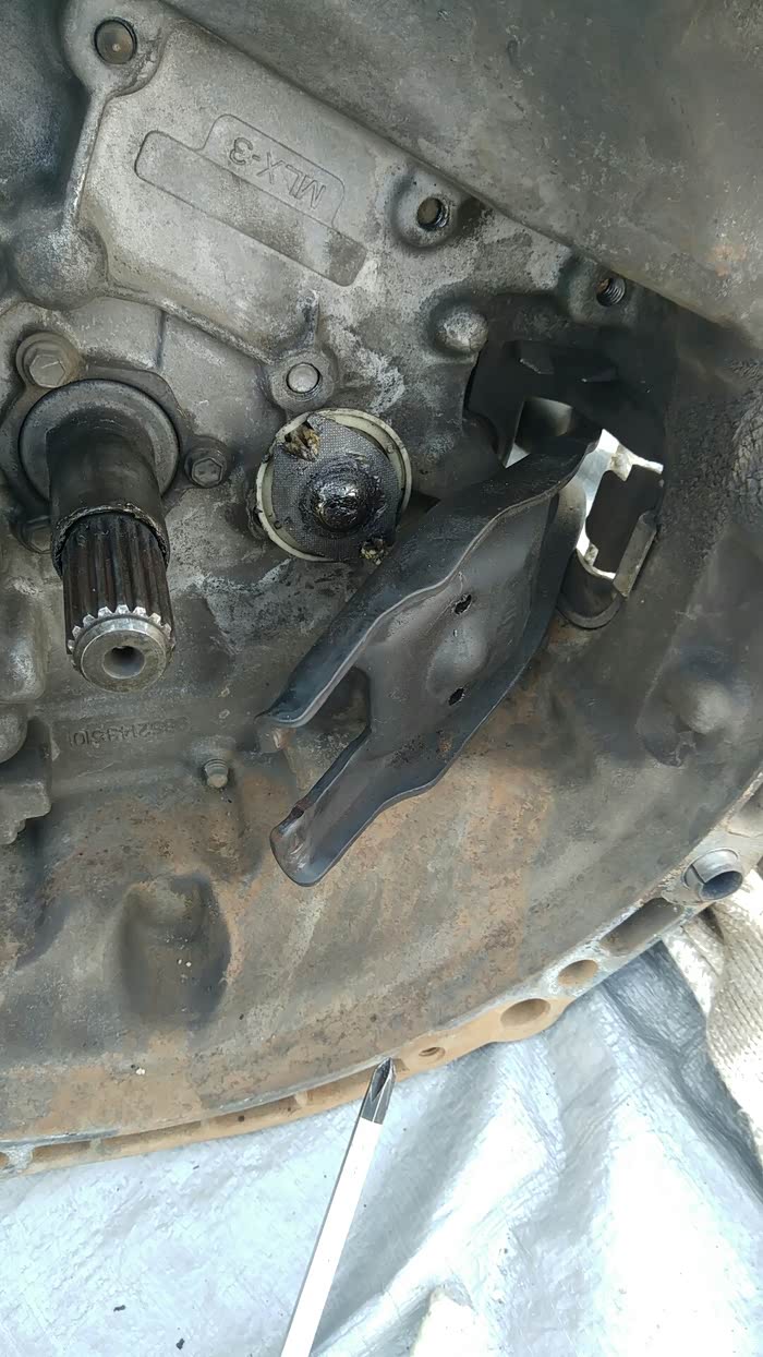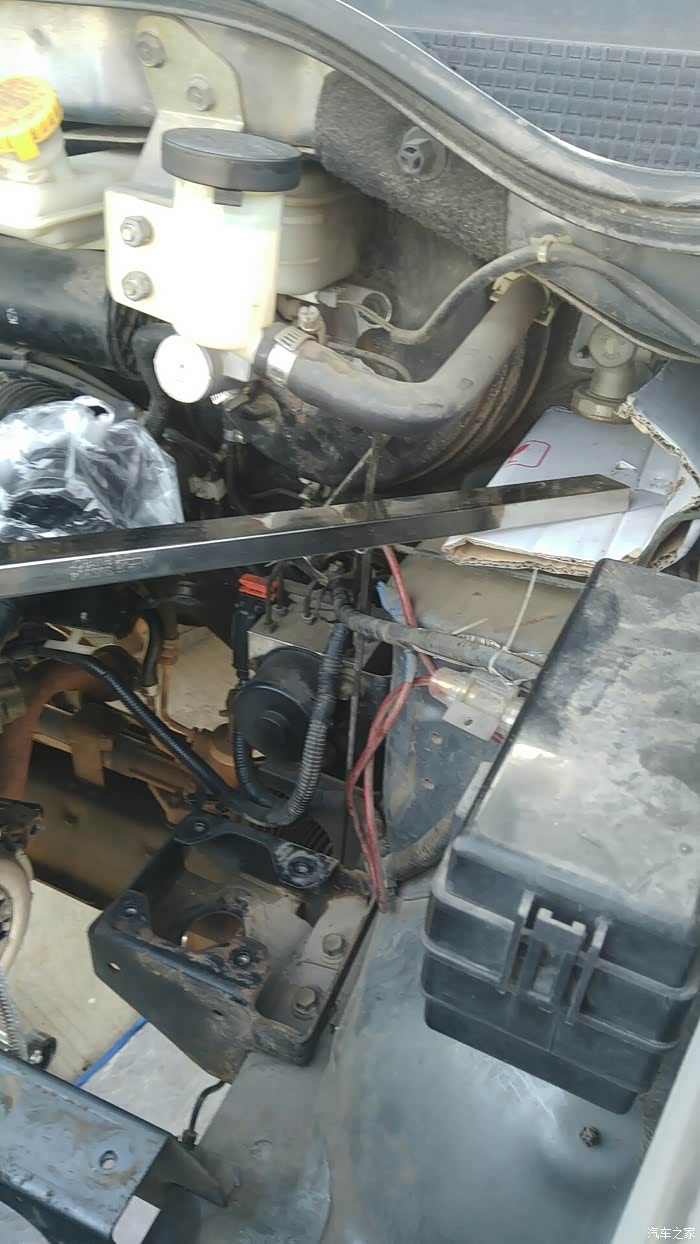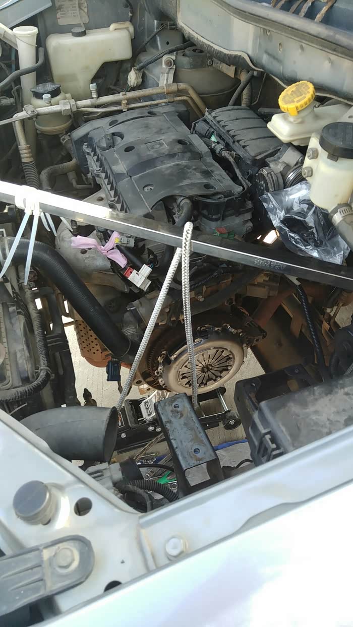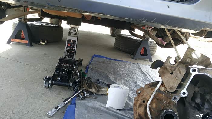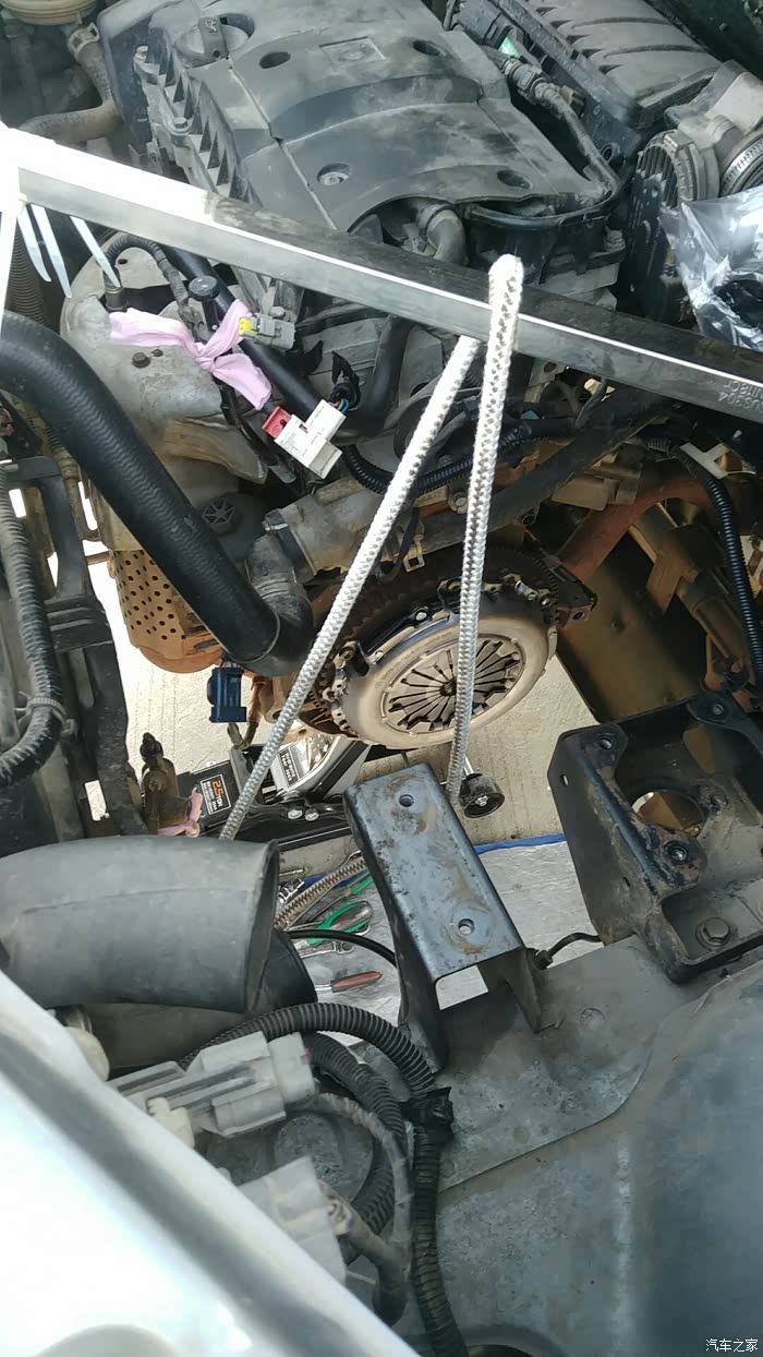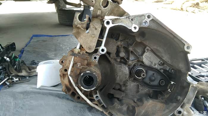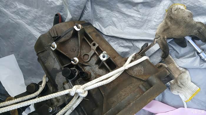 绑好波箱,再出来拆轮胎,拆了左边拆右边,然后把两边的半轴都拉出来,用东西绑好,不要影响到待会拆波箱。媳妇在上面用一支不锈钢方管(25Ⅹ30,1.2厚的)一头放在左减震上面支架上,另一头她抬着,绳子绕过不锈钢管,一头穿过发动机脚支架上(怕拉不住,安全保障)。开始拆波箱与发动机连接的螺丝,不多,好像是6枚,还有启动马达三枚螺丝,先拆掉启动马达,拆出三枚螺丝把马达放右边就行,不必拆线,把把所有螺丝拆掉后,媳妇在上面抬,我在下面顶,把波箱与发动机分离后,两人慢慢的放,把波箱放下,抬出