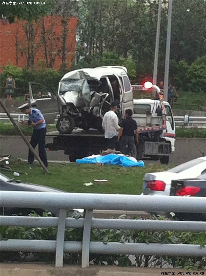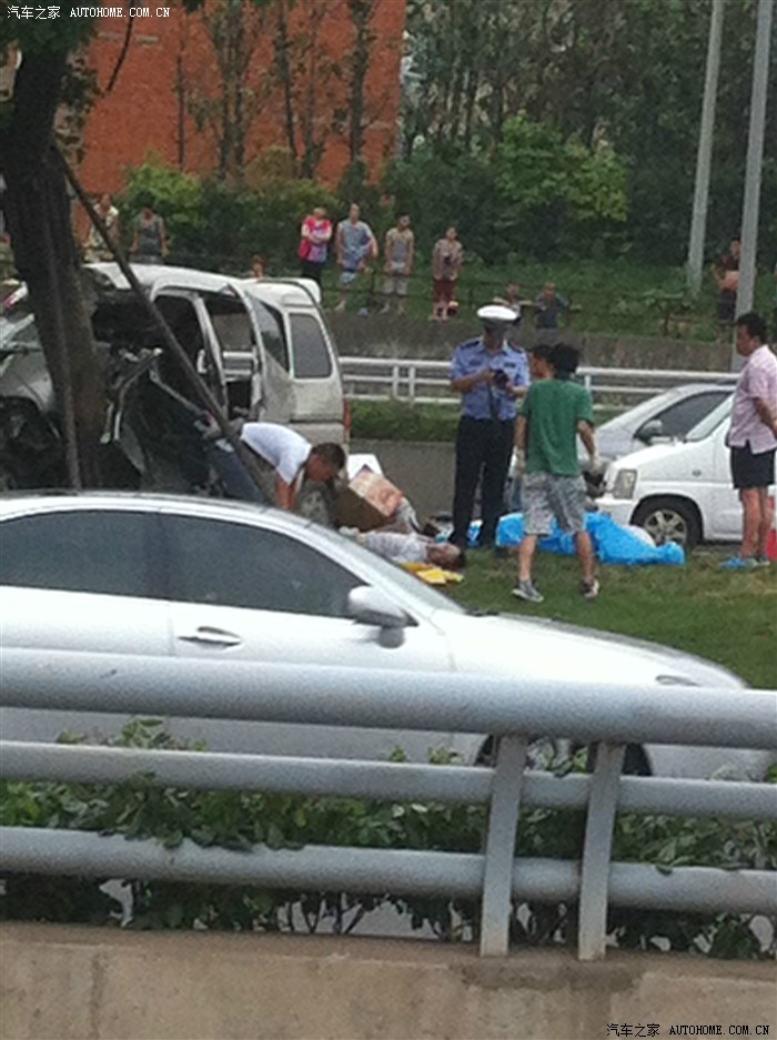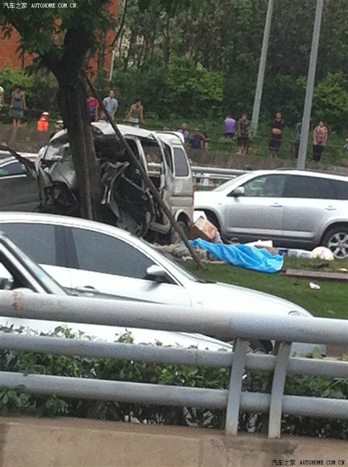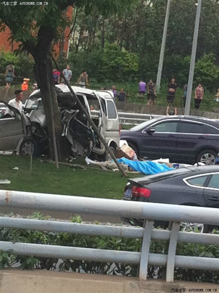 树都撞歪了,车子报废。驾驶员当场死亡,血的教训。大家开车一定要注意安全。撞上绿化带在撞树,还这么厉害,不知道开多快,面包车没车头的,安全系数本来就低还这么快。