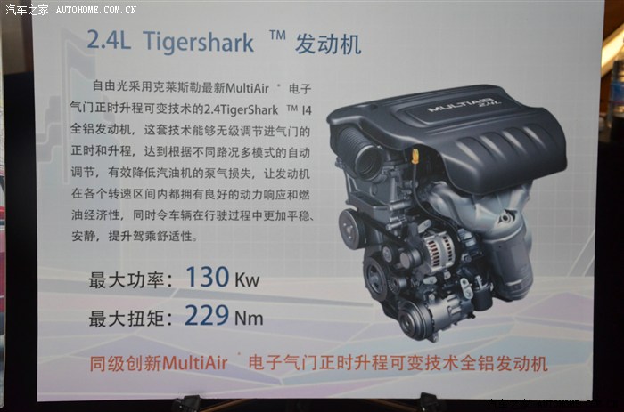 Jeep自由光使用的是首次被应用于SUV车型的2.4升虎鲨发动机。它凭借独门绝技MultiAir2?电子气门正时升程可变技术,能够精准控制节气门开启时间和角度,有效提高发动机能效。新技术的应用使这款发动机比其他传统气门技术的发动机燃油经济性提高7.5%。
