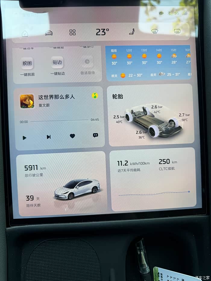 还有一些细节的问题说一下,车在市区通勤状态下续航最低可以跑到500公里左右,因为车是400V平台在快充桩最高可以跑到94-96kw的功率,慢充桩基本接近7kw,有条件还是在家里扯个慢充桩比较好,还保护电池还不用等待充电。音响的音质还算不错,21喇叭的音效还行,但是还有进步的空间,提车以后因为是全景天幕,所以贴了一个冰甲天幕,夏天确实隔热了许多,但是贴一定要到正规的地方贴,别贪图便宜,我贴的比较贵但是效果确实很好。夏天车里的空调制冷效果很赞,降温速度确实很快。