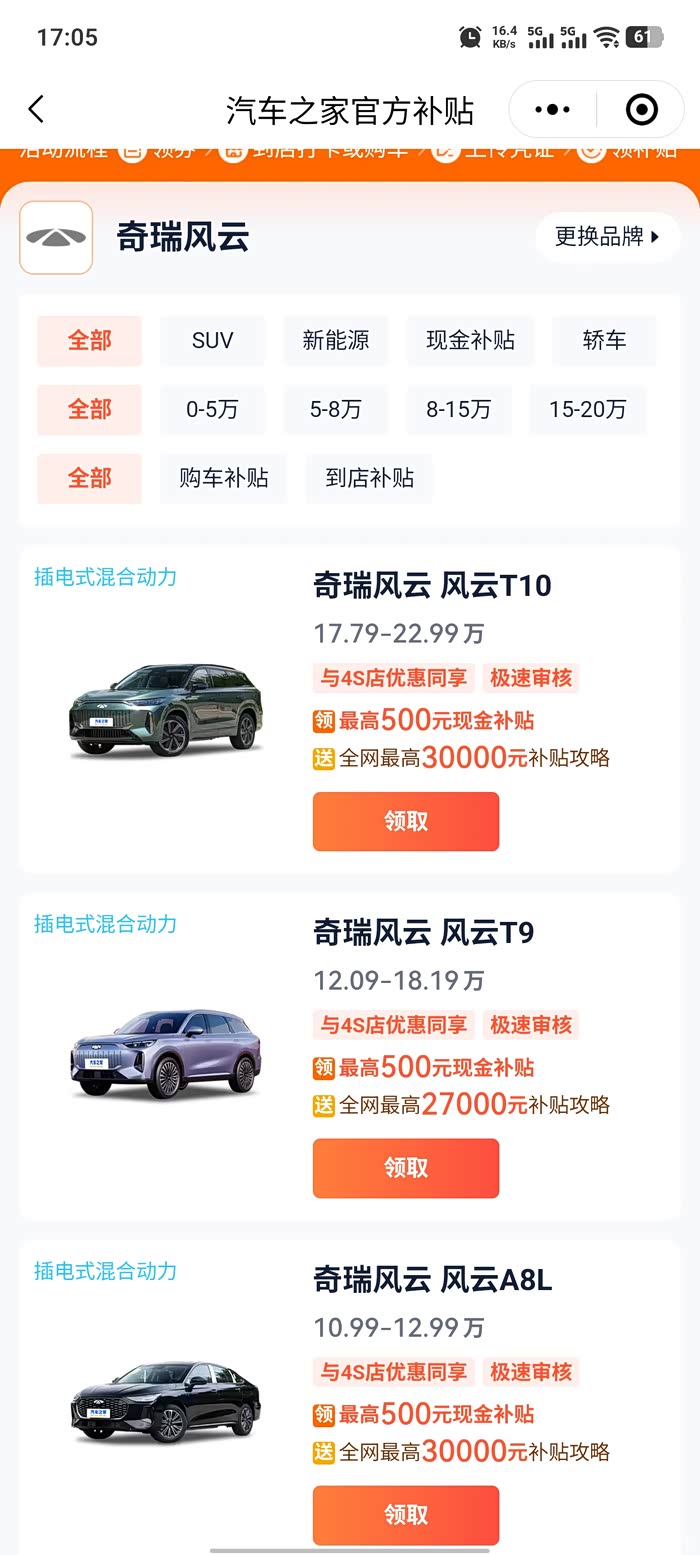 友友们,汽车之家超级贴又来啦,即日起,凡购买奇瑞瑞虎及风云系列,可额外补贴500元现金(补贴和店面无关,由之家平台直接发放给购车用户)