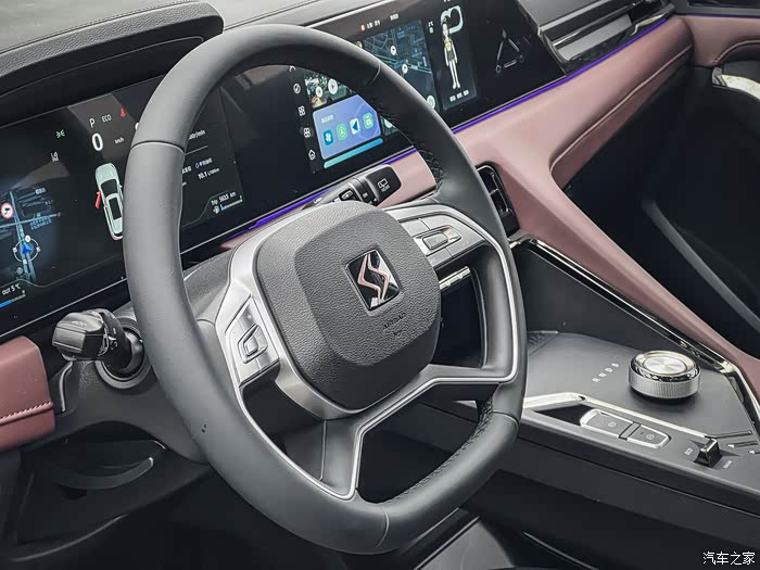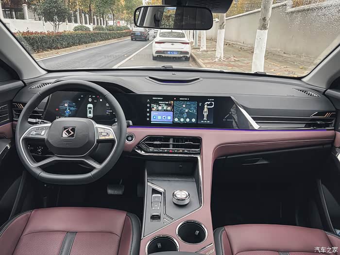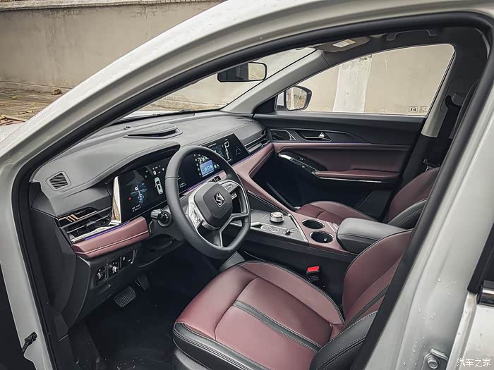 再来看看内饰,拉开门一看,不得不夸一下,整体看着很高级,拼色内饰,黑拼酒红色,不是那种看着很汽配城的感觉,而是非常的有质感,每一个按键都有阻尼感,体验感很好。