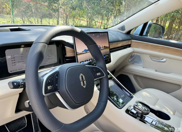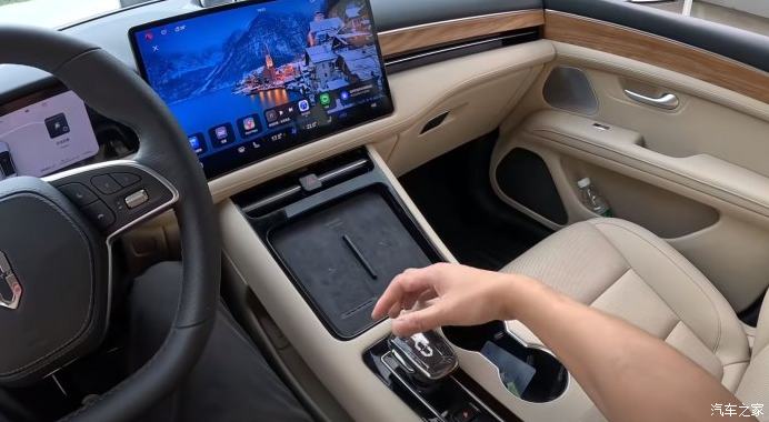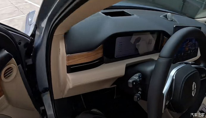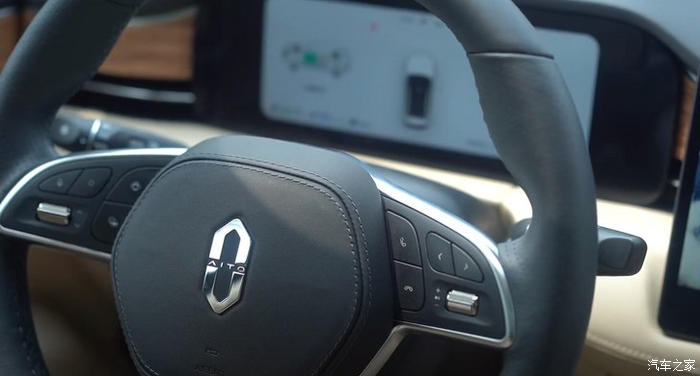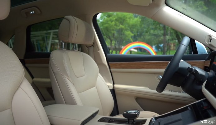 内饰风格简单又豪华,米色的真皮面料搭配木纹式板让整个内饰看起来就很奢华,坐进去的第一感觉很温馨,没有太单调也没有很孤独,它的15.6英寸的中控屏是很好玩的,用的是华为的系统,操作十分流畅。