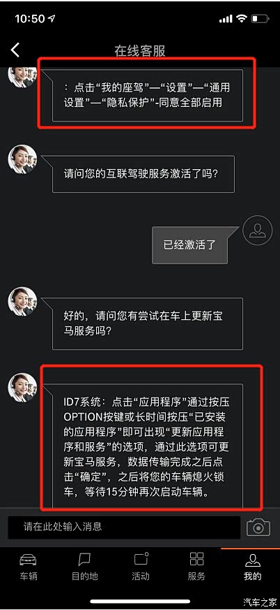 后来找到在线客服,她通过app跟我交流,告诉我在车上设置上把隐私设置打开然后更新就可以了,详情可以看下面的截图