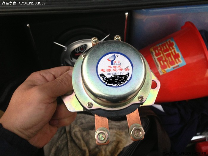 大电流继电器,两个大的接线柱接低音炮火线,小的把点烟器上的两根线引出接上即可,中间可以加上一个按钮开关或船型开关,停车时可以单独关上低音炮听音乐。