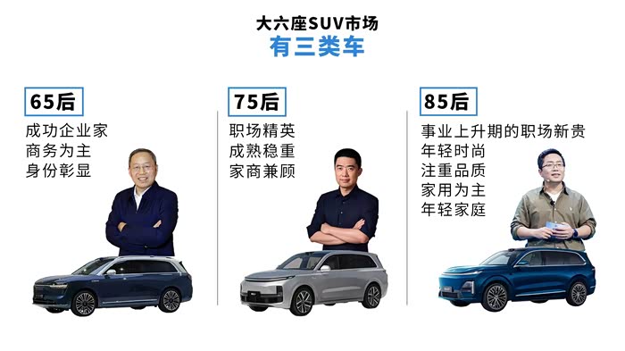那,就是这张图。大型国产六座SUV天下三分已定。65后开问界M9、75后开理想L9、85后开深蓝S09,就很合理。