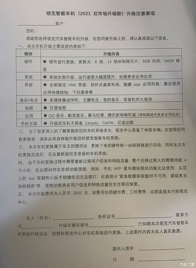 2950元的车机升级协议