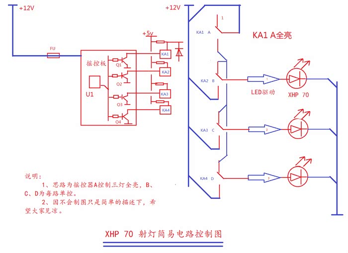 为了便于控制 ,买的四路自锁 无线摇控器,初设想是,A.全亮,其它B,C,D.分别控制一路LED .