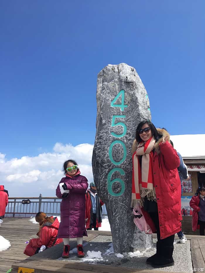 到了停车区后走到索道票等观光车,观光车票20元/人,索道票180元/人,1.2m以下免票,拿票排队等观光车,旅行团多大概等半个小时就可以上车了,观光车到索道站要上山半个小时,然后再排队坐索道上山,10分钟左右可以到海拔4506米的观景台,一路上山有点过快,海拔上升得快会容易高反,都看到好几个人高反吐了。 还好女儿很棒,第一次做高山索道很兴奋,不恐高,还说索道怎么这么快就到了。孩子不懂高原是什么,带孩子上去的家长最好看着,上到山顶后第一次见到雪的女儿很兴奋跑起来说要打雪仗,被我控制着了,不然容易高反。