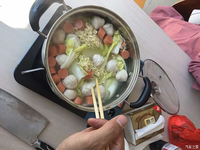 午饭吃个面,我还能吃点辣,老婆不怎么吃,孩子一点都吃不了辣,只能带齐装备路上自己煮点。