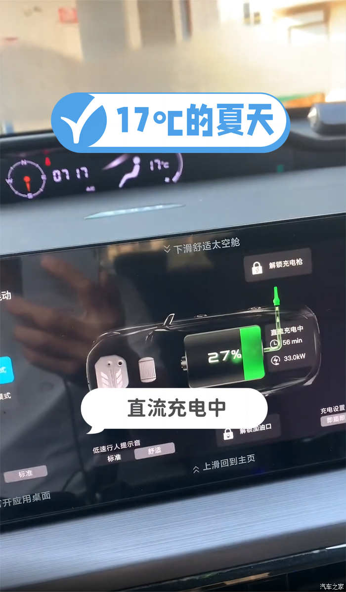 直流快充中,从27%到充满,还需56分钟。不充满的话,充到80%,一般半个小时左右