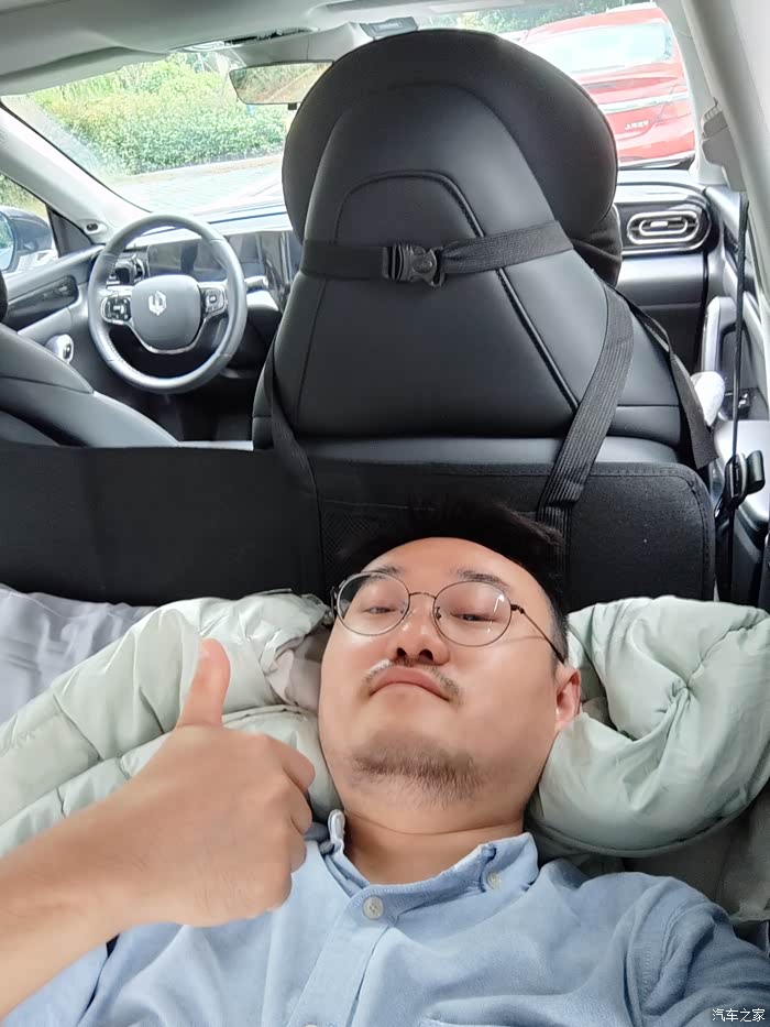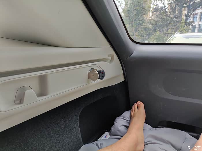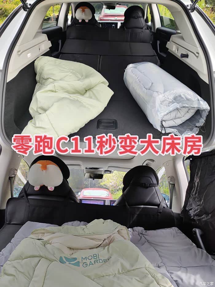 零跑C11的后排放倒了之后,虽然有一点的倾斜角度,但是整体上来说是纯平的。在车里睡觉的基本条件是有的,但是还需要一些装备的配合。