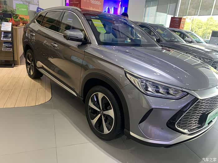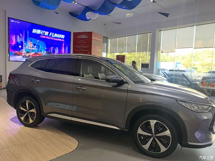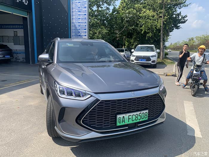首先到店看到车的实物外观,很大气,这个灰色感觉比较高级,说真的,有吸引到我,拍照这样看车前脸跟汉有点像。整体没有一点笨重的感觉,这个跟网上评的一样,外观没有让人失望。蓝色的日行灯挺新颖,很柔和,没有很扎眼。内饰方面豪华,超大的屏幕,触屏的,很敏感,轻轻触碰一下就能操控,90度旋转,还能语音操控,科技感满满的。销售给我演示了一下摄像头,画像清晰,四个方位都能清晰看到周边环境。
