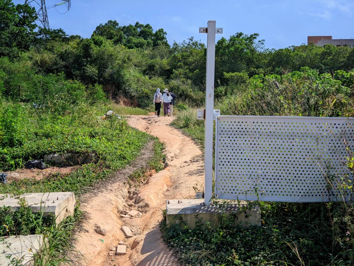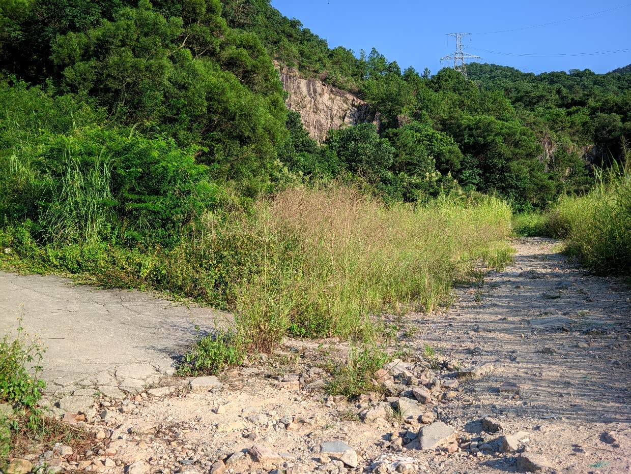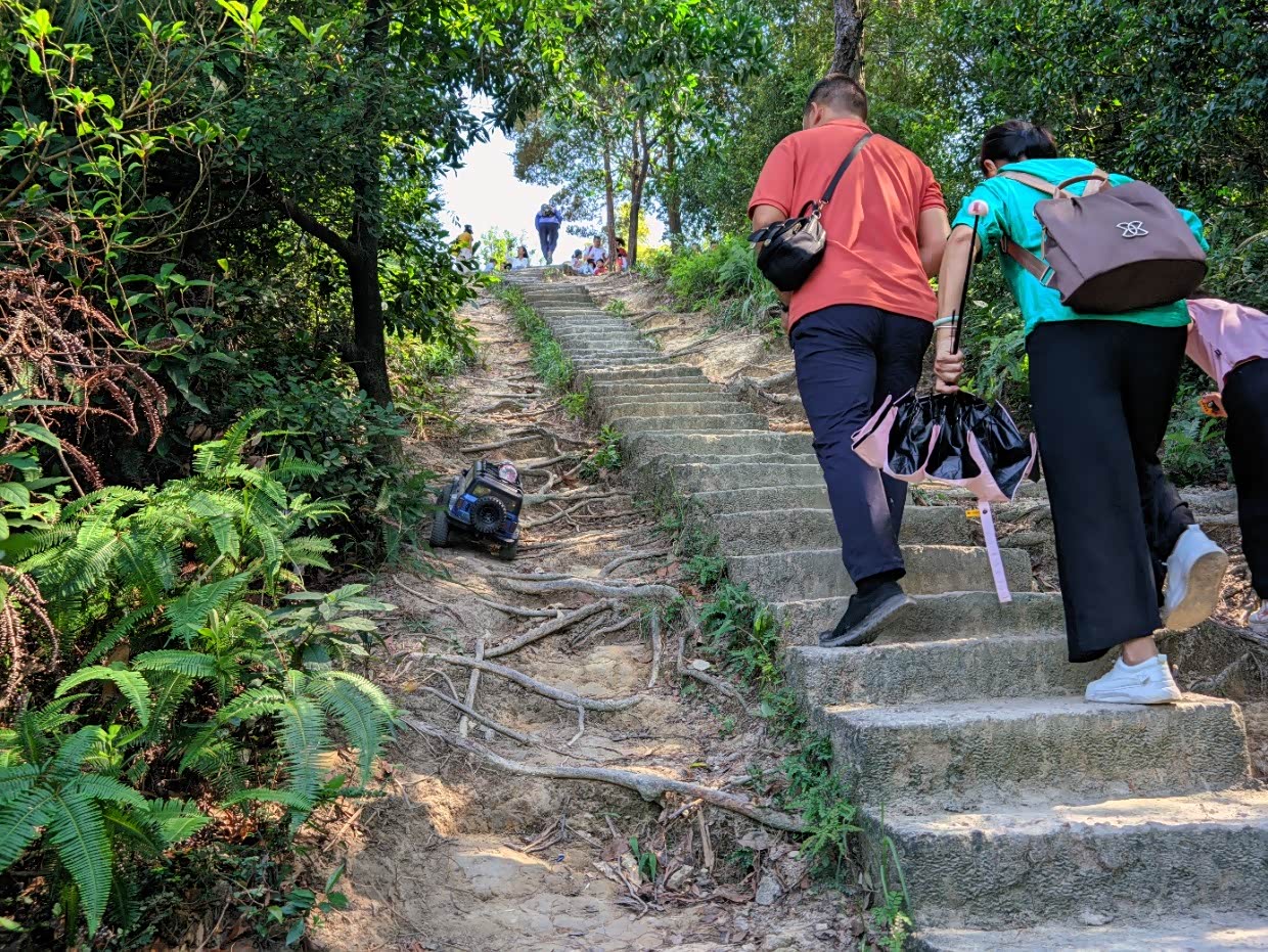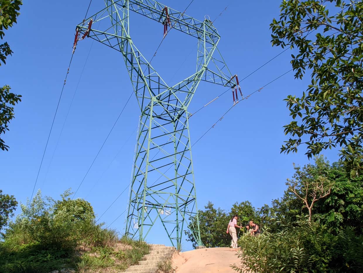 沿着水泥路和阶梯一路走,走过2个“铁塔”,第三个绿色“铁塔”右拐,又开始一段新的泥石路。