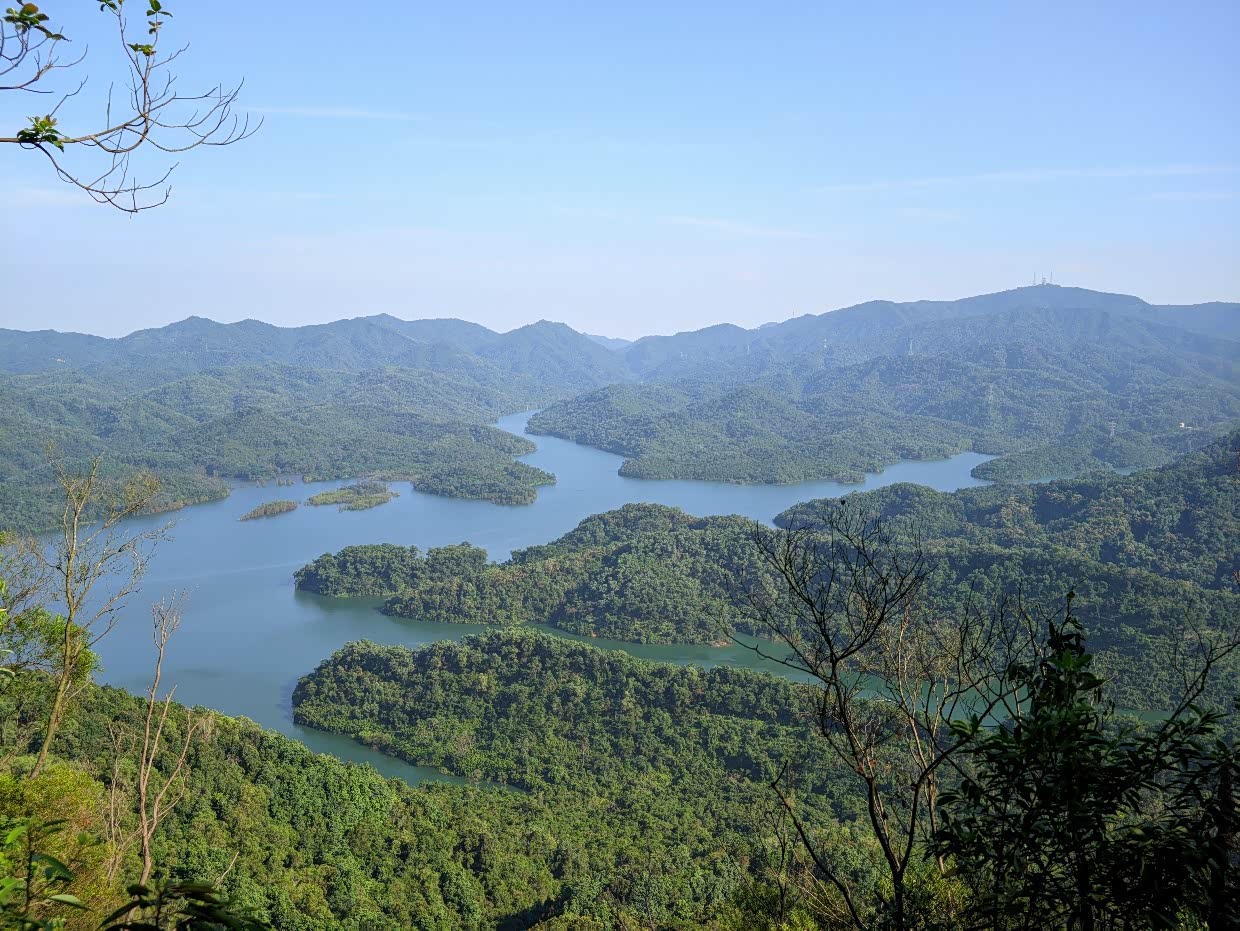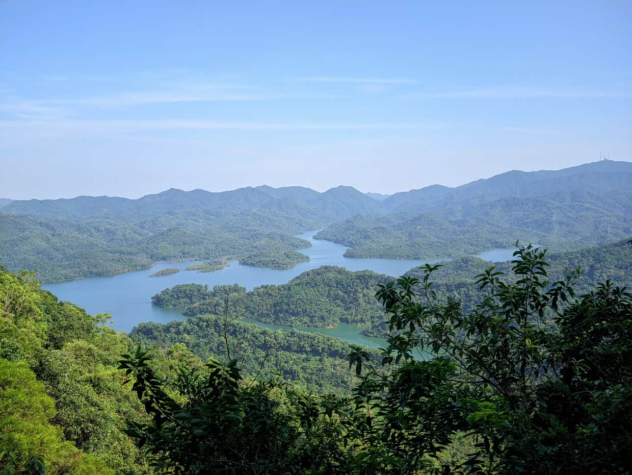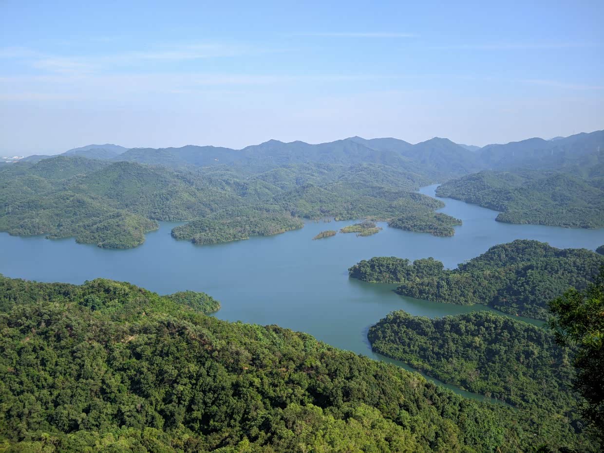 走过三个山头就到狮头山看长江水库的地方。狮头山的山顶景观广阔,游客可以眺望到长江水库的全景。山顶的视角如同浙江千岛湖一般,湖面上的岛屿如串串珍珠,与周围山峦相映成趣。目前山顶观景台新设置了围栏,但不少游客翻越出去拍照,为了摆拍真心不建议。