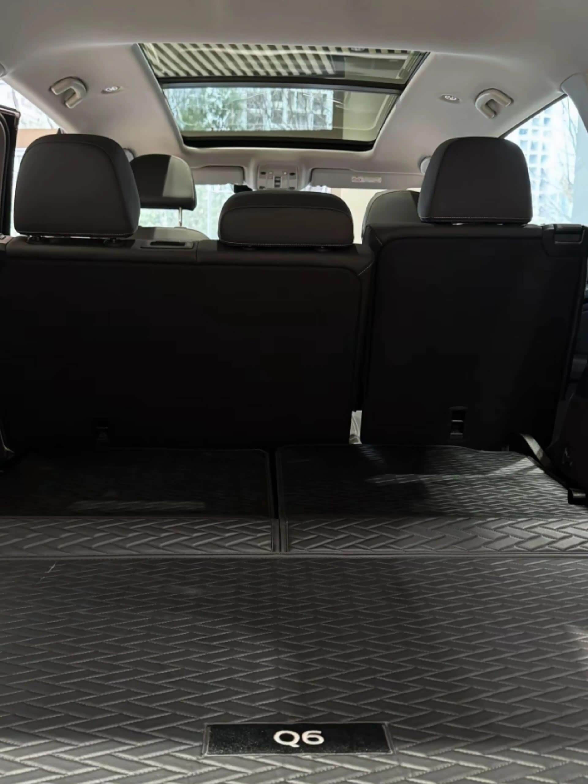 这车看着就显大,五米多的车身长度,轴距逼近三米,数据上比Q7、X5都多出一截46。但数据是冷的,生活是热的。最打动我的,是它把每一寸尺寸都转化成了实实在在的“能装”。上个月带全家去海边露营,出发前我爱人看着地上堆成小山的装备直发愁:两个26寸行李箱、帐篷、天幕、折叠桌椅、车载冰箱、孩子的挖沙工具箱,还有两辆拆开的儿童平衡车。我默默把第三排座椅一键放平——Q6的后备厢瞬间从日常够用的286升,膨胀成一个将近2400升的“移动仓库”。