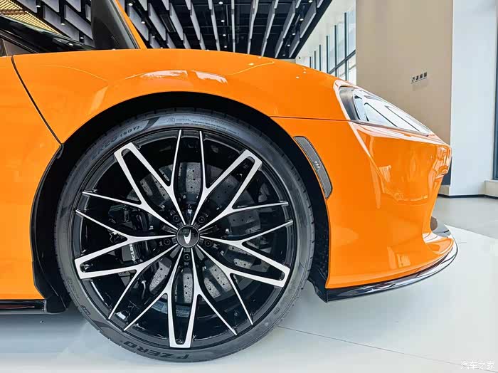 车轮尺寸也是这台车需要说到的,轮毂选的是一个钻石切割的轮毂,采用由倍耐力专属定制的轮胎,轮胎尺寸前轮为20寸,后轮为21寸。另外就是这辆车的离地间隙,新车最小离地间隙达到110mm,是目前迈凯伦量产车辆里面最高的。这个离地间隙之下的接近角有9.7度,另外他还有个底盘升降功能,开起时可以将离地间隙提高到130MM,。这样的离地间隙可以保证它在城市通勤中有非常高的通过性。
