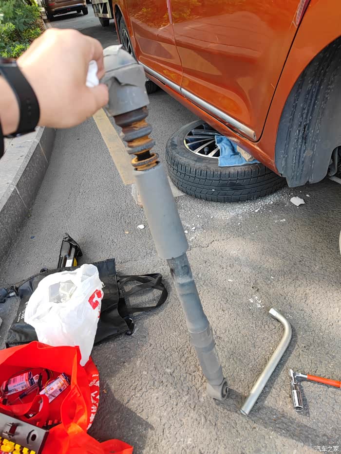 春节假期发现行程总是吱吱嘎嘎的异响,特别是天气冷的时候更加明显,总想找找原因。一天无意发现减震器胶套都乱掉了,寻思着更换减震器和胶套,于是开始行动。
