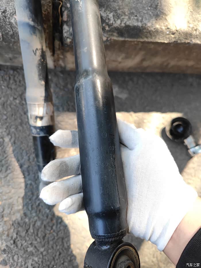 拆下的减震器,减震器顶端需要专业工具才能拆下,旧减震器不能回弹了,新的回弹很快,然后胶套也更换新的。一个人操作不好拍照片。