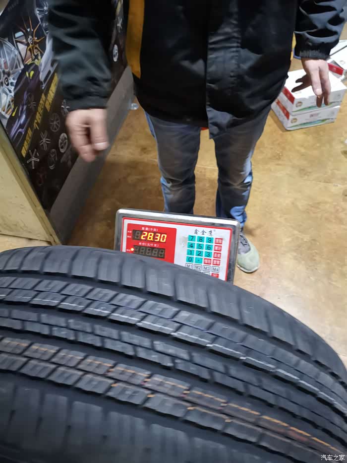 安好轮胎、胎压模块,打好气后重28.3KG。