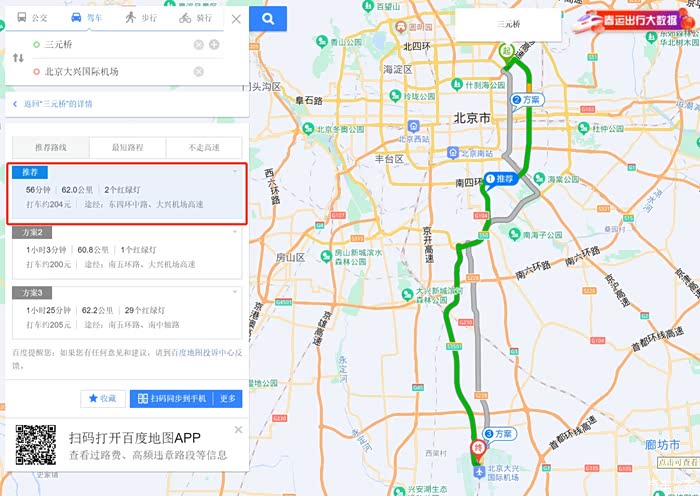 正好送朋友去大兴机场,这是他开工后的第一飞。给大家看下距离,从三元桥到大兴机场大约是62公里的路程,打车的话目测得200元出去了,所以开新能源车花费少的优势就出来了。这里给大家讲个冷知识,纯电车百公里用电大概是14到18度电,我用的是公共充电桩,一般每度电在1.2-1.5元。所以开自己纯电车送朋友去大兴机场,真的是明智的选择。