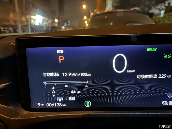 行驶6里后,能耗显示12.4kWh/100KM。我发现一个规律,就是能耗随车速有升有降的时候,所以相对应时速的能耗最具有参考价值。