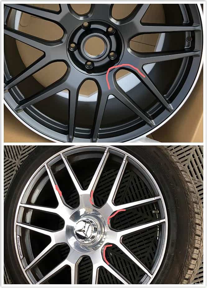 原厂轮毂其实也不一样,黑色轮毂按照原厂一比一定制的,划红线位置银色有个台阶,黑色直接下切下去的,所以黑色要比银色的显得厚重