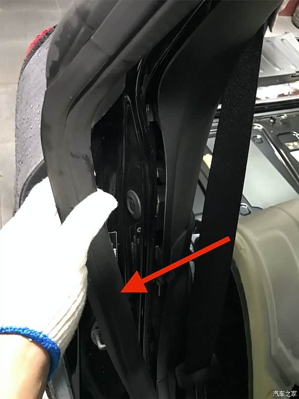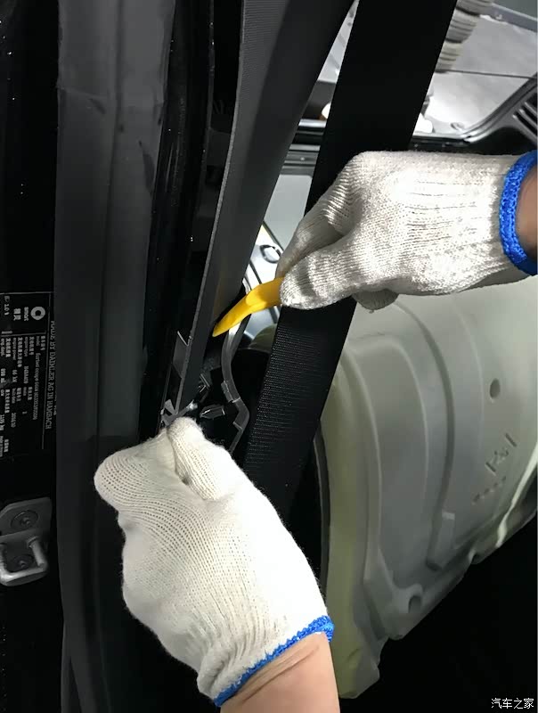 转战副驾驶车门边缘,将副驾驶车门密封条拉出车框,进行上层内饰板拆卸工作