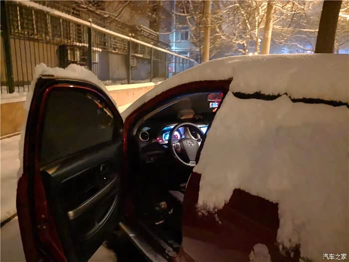 出发之前,我们先打开车门,启动汽车,打开空调,并把出风口调整至吹前挡风模式,然后打开后挡风加热功能。完成这些后就下车用小拖把或者除雪铲把前挡风和车窗玻璃的上的雪除一下,不然没有办法上路!