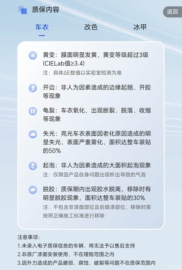 产品带质保码,可以登记,上面有质保选项,以及破损修复价格。有些品牌的隐形车衣,商家说终身免费补,不知道是不是真的。