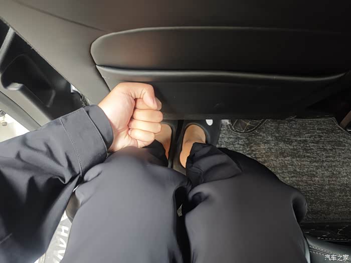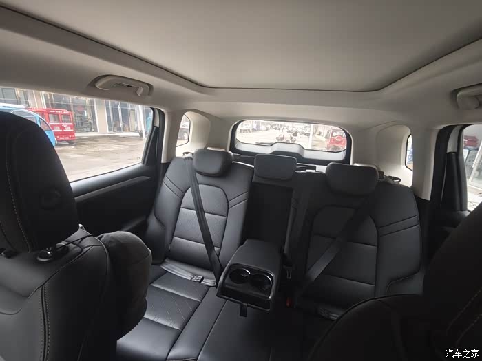 后排空间也是一样的,前排调好距离,后排的腿部还有一拳多的富余。并且头部也有一拳的富余,因为大狗是方盒子造型,车顶都是平直的,不会有特别向下的幅度,没有牺牲头部空间。