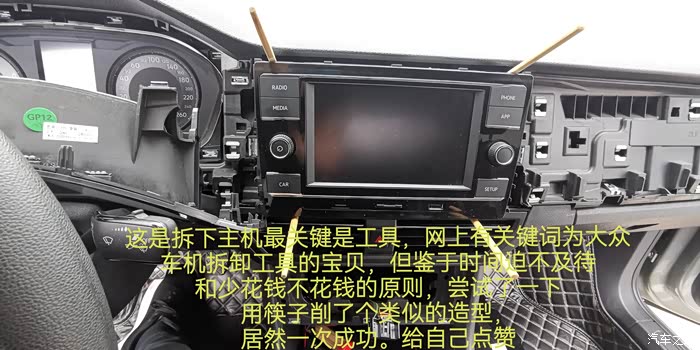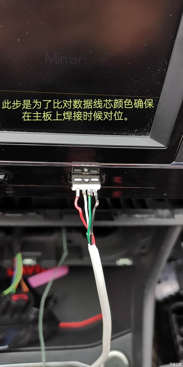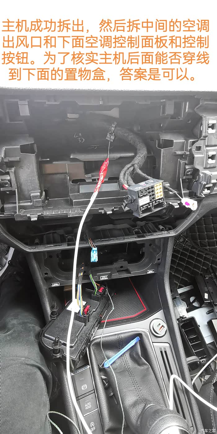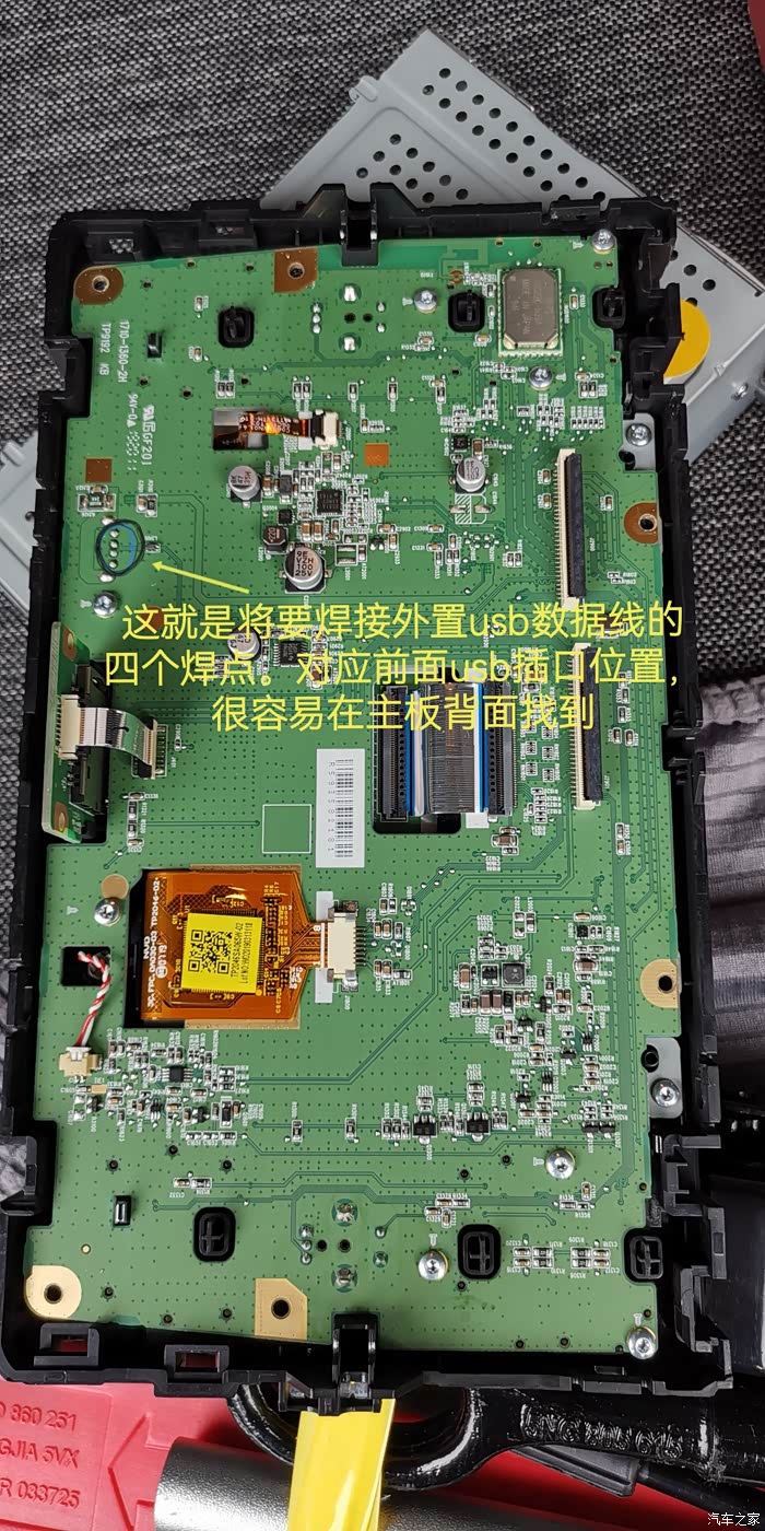 最最最关键是车子只有车机屏幕正面一个u***数据插口,在手套箱等隐藏地方未预留u***口,对于处女座强迫症患者的我来说,视线范围内有根数据线挂个转换盒子是一定无法接受的。所以网上查询此车中控面板和车机拆除视频后决定折腾开始。对比盒子大小,散热需求,个人美观要求后,初步主意是从车机主板焊接一根数据线从里面拉到空调控制区域下面的放置区开孔拉出插盒子。有了方向就开干。折腾开始,主要步骤和注意事项下面图片内有文字说明