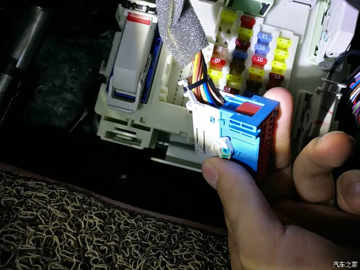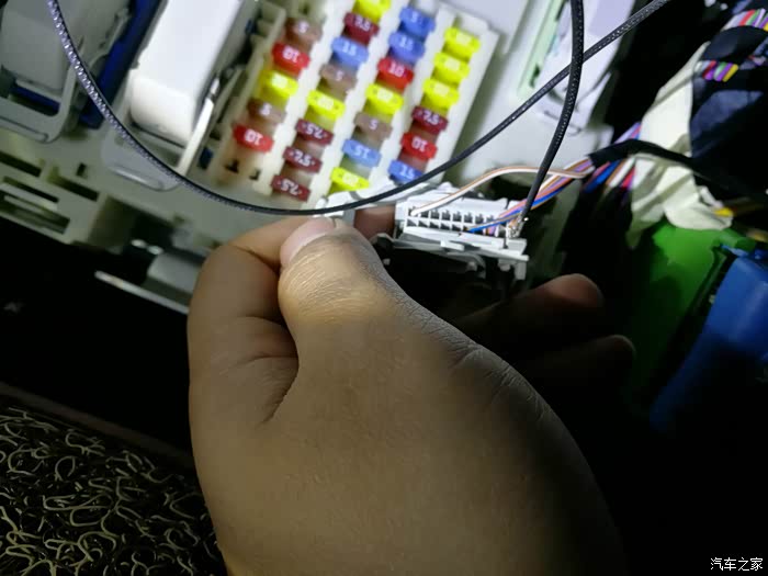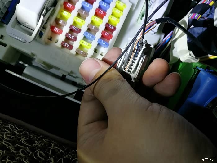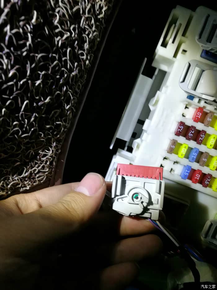 副驾驶也是一样的,插头插在灯的黑色锁扣上面,两根取电的红线跟黑线暂时不管,继续走线