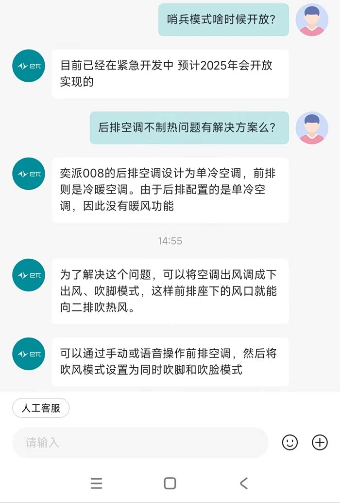 哨兵模式和后排冬季取暖问题奕派客服的解答