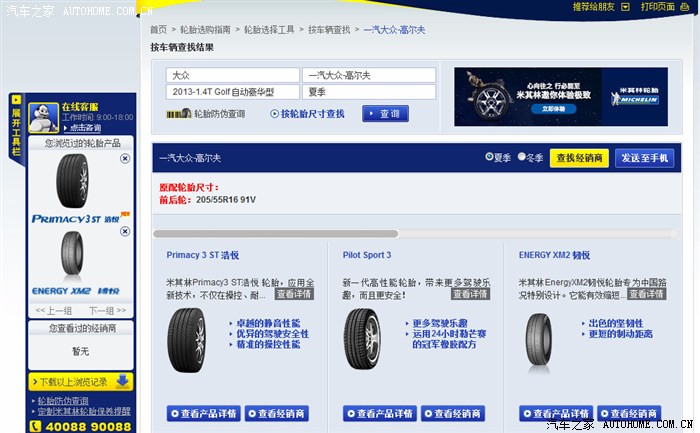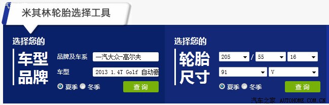 2、 在专区页面底部的“轮胎选择工具”,查看高尔夫适配的轮胎选择。可以通过车型选择,也可以直接查询高尔夫的 205/55R16,225/45R17 等适用轮胎型号