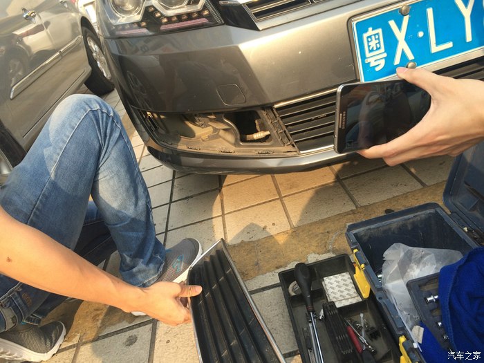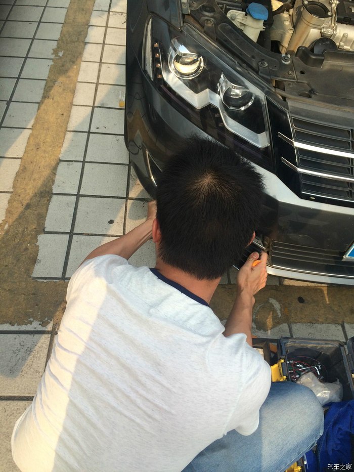 师傅正在接线,直接着车就亮! 本想接在自动大灯的半我回家功能上的,无奈师傅不会接 。。。。