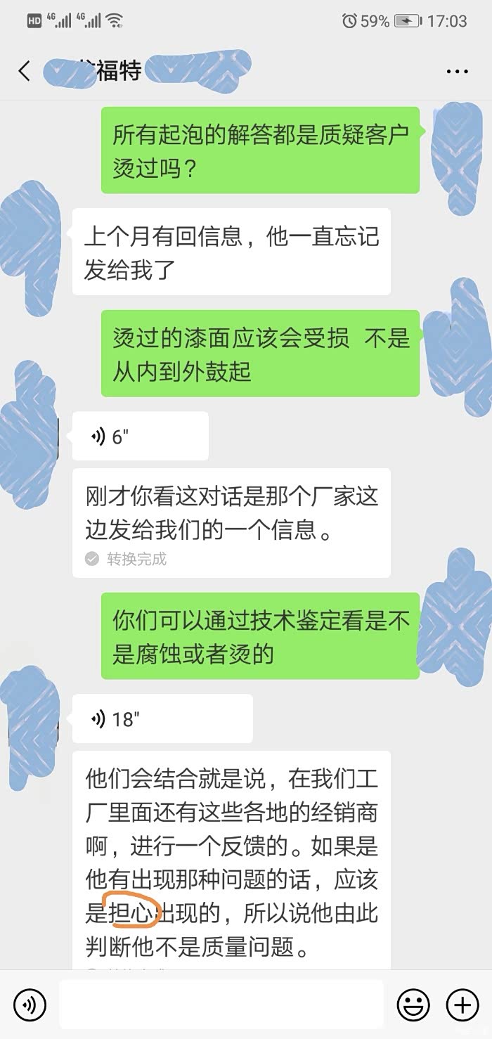 厂家说因为要结合各地经销商的情况看,不是全国大批量出现的问题,就不是车的质量问题,就属于客户造成的,比如烫了,腐蚀了。