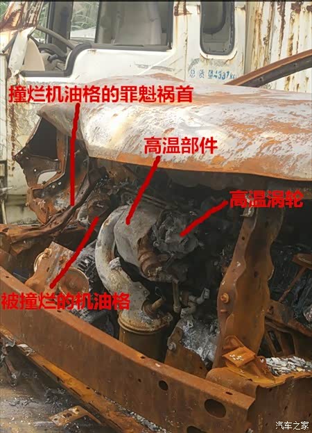 现在我很庆幸我活过来了。但是比亚迪S7的1.5T的发动机设计和整车设计存在巨大安全隐患,此图为证:脆弱的机油格被比亚迪一根细梁撞烂,旁边是高温部件和高温涡轮。