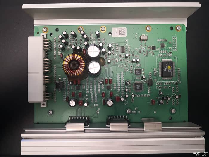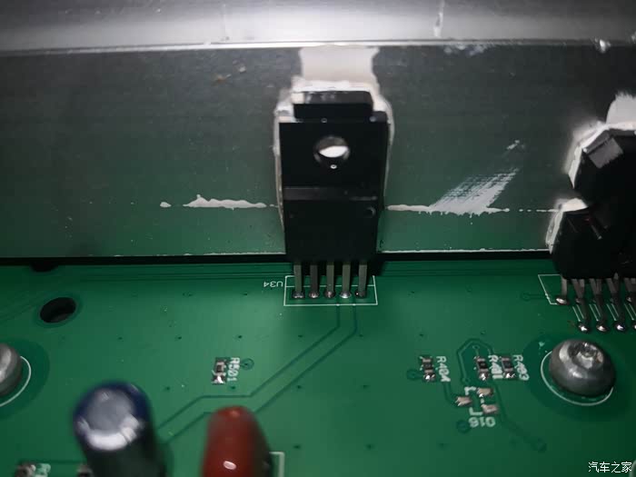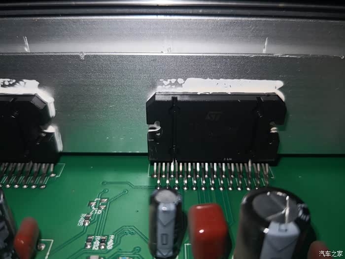 图13:整体散热片上左边最小的12V-转5V电源模块ROHM公司的BA05CC0WT,右边紧挨着的是功放芯片ST意法半导体公司的TDA7563,每片提供50W*4路放大,两片共8路