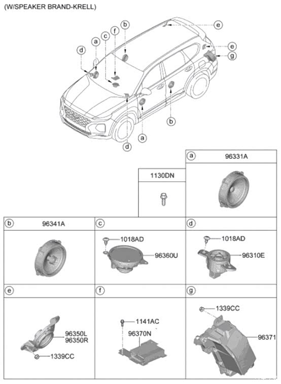 再看第二个功放版,全车KRELL品牌喇叭,前门a各两只96331A(6.5寸 4欧 正常20W/最大40W 中低频),后门b各两只96341A(6.5寸 2欧 正常30W/最大60W 全频),仪表台上方c一只96360U(4寸 4欧 正常20W/最大40W 全频),仪表台d两只96310E高音,后备箱e两只96350L/R低音单元(英文原文: SUB WOOFER - DUAL VOICE COIL, SPEAKER BRAND - INFINITY, EXTERNAL AMP - AMP, SPEAKER - SURROUND SOUND, MANUAL A/CON - BUILT IN TYPE),仪表台下方f一只96370N功放(S/PDIF数字输入,10路输出,HARMAN,96370-S1200 ),后备箱g一只左后部的低音炮96371。功放版的2020美版四代胜达的音响是相当给力。就是不知道北现国产优化后,安装位置的螺母位置是否跟美版一致,有没有预留喇叭线束。好吧,我可能想多了。