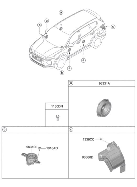 美版2020 Hyundai Santa Fe四代胜达有两个音响配置,先看第一个普通无功放版4门a各一只96331A(6.5寸 4欧 正常20W/最大40W 中低频),两只b高音96310E,一只后备箱左后部的低音炮96380D,注意哦,普版带炮。