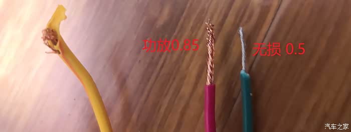 请看左边是御翔原车拆下连功放到喇叭0.85平方纯铜的标准线,右边是转接头0.5不知材质这种劣质DSP无损转接头,那些动辄大价钱去选择了好的功放,换了好的喇叭,改了电源线和喇叭线的人,留意过这个小小的无损转接头了没,前面所有的努力都泡汤了,瓶颈卡在了这里。所以各位装功放的朋友,大钱都花了,别在这个小物件上翻了。就问线材多粗,什么材质,不到0.85都不如原车的。