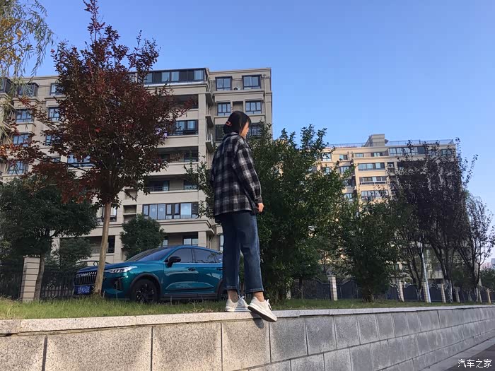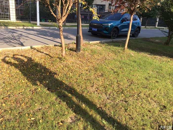看,稍微有一点点阳光后暴走蓝的颜色有一些渐变了,蓝色的车漆色,绿色的树叶和草坪,相得益彰
