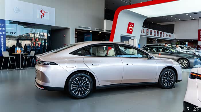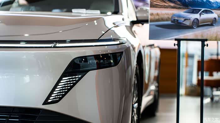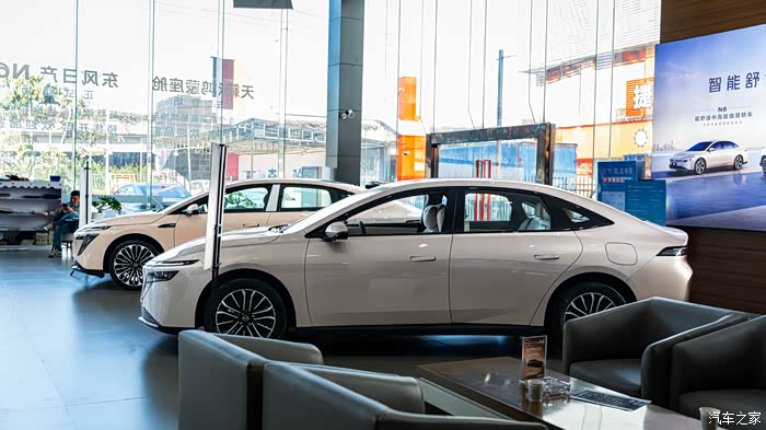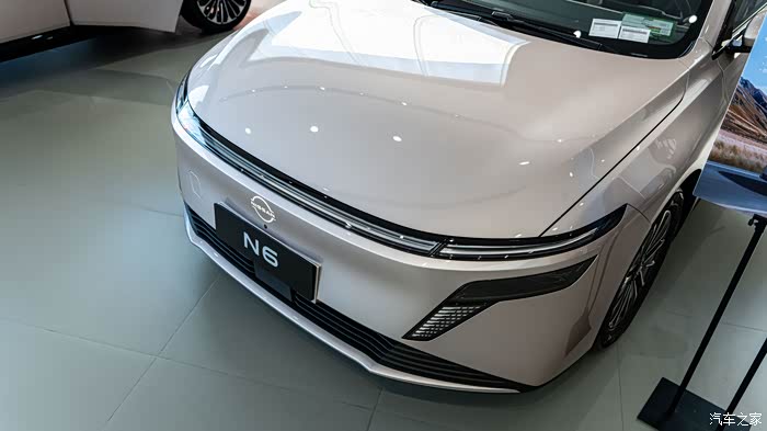到了 4S 店,门口还摆着 N6 的上市海报,写着 “大电池超舒适插混轿车”,进门第一眼就瞅见 C 位的 N6 了。