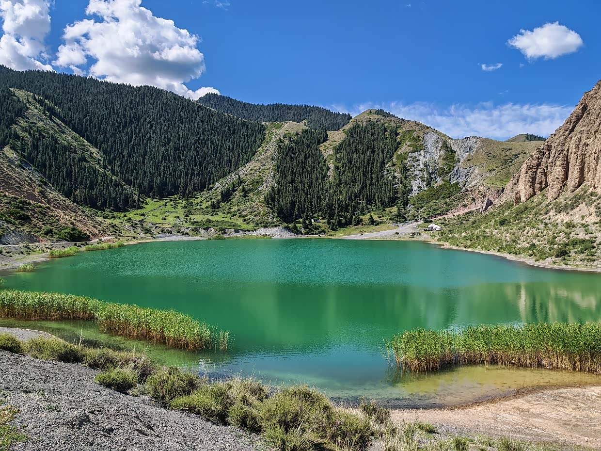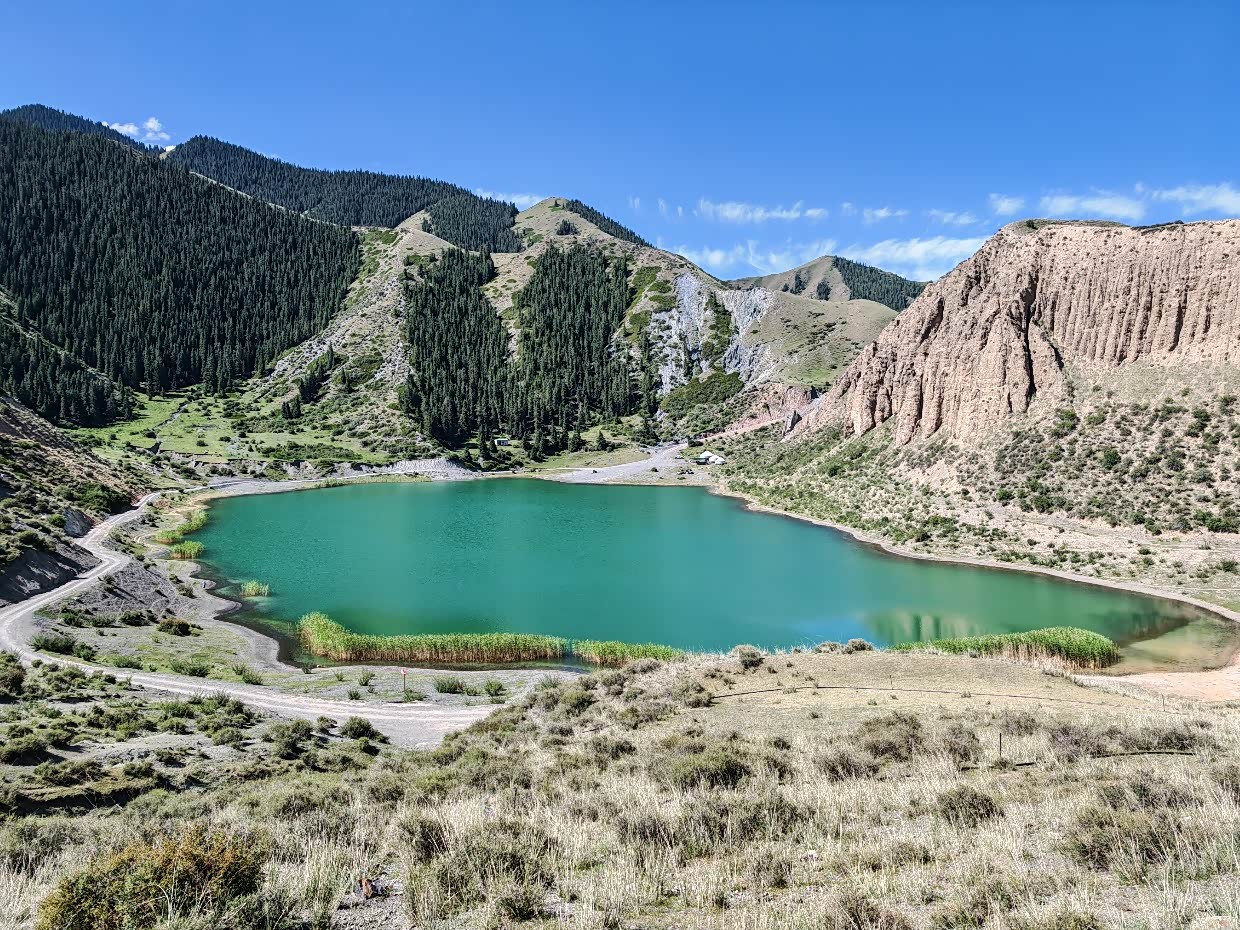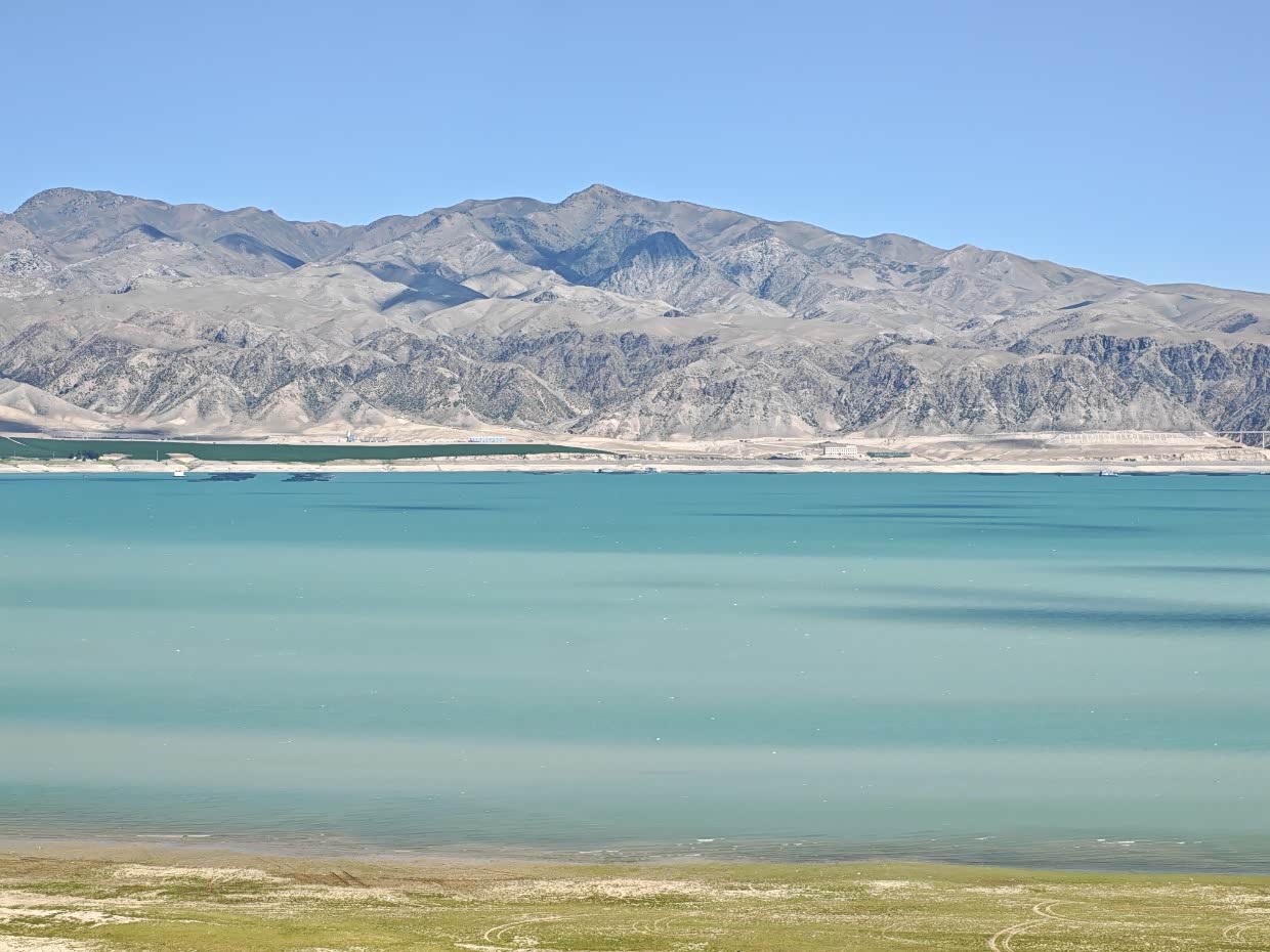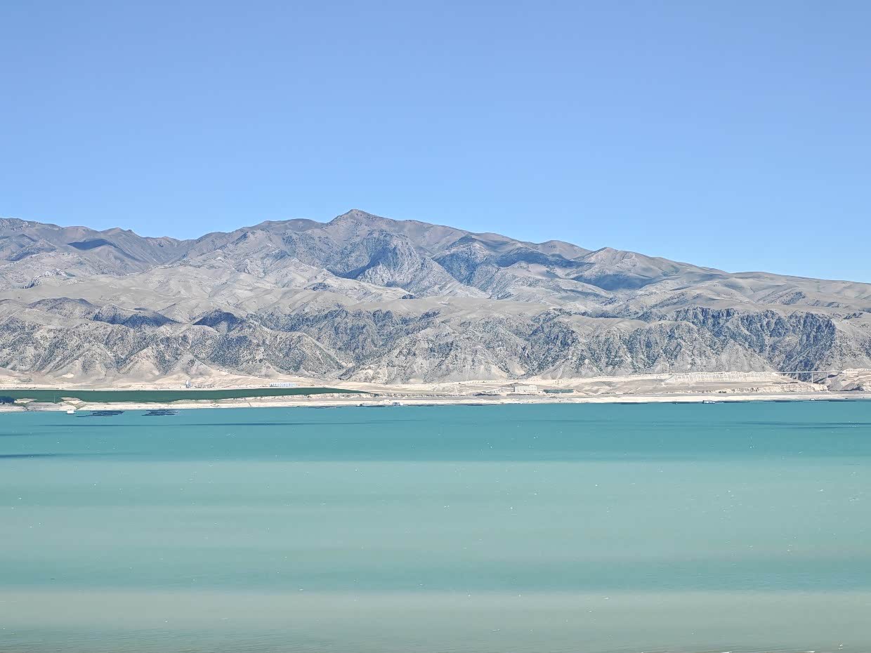 第二天起去库尔德宁的路上路过恰海:哈萨克语意为“会唱歌的湖泊”,因风声与湖水共鸣得名,属于人工高山湖泊,水域面积58平方公里,最大水深超90米,湖岸线30公里,被誉为“西域小三峡”“新疆第一库”,颜色有时候在夏季算是赛里木湖的平替版。